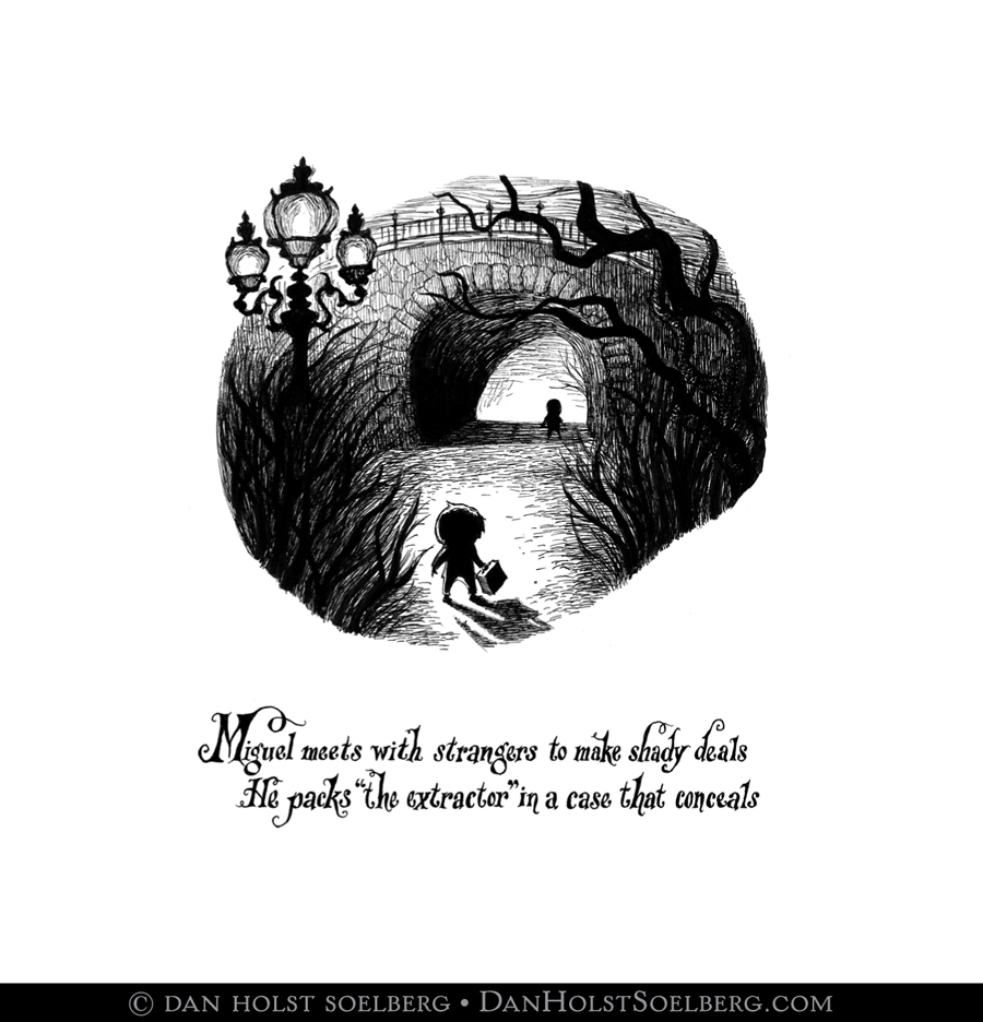 Original black ink artwork published in the book Dwellers of Lurching Swill. Original hand-rendered text accompanies the illustration exactly as shown.