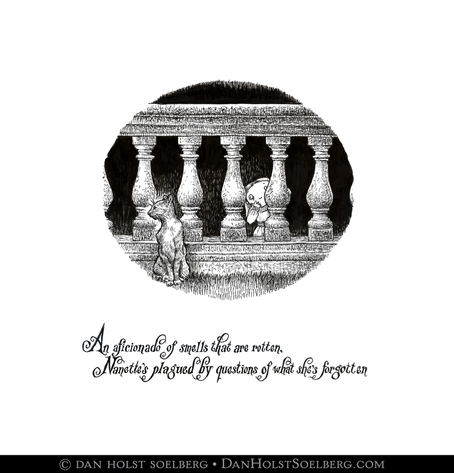 Original black ink artwork published in the book Dwellers of Lurching Swill. Original hand-rendered text accompanies the illustration exactly as shown.